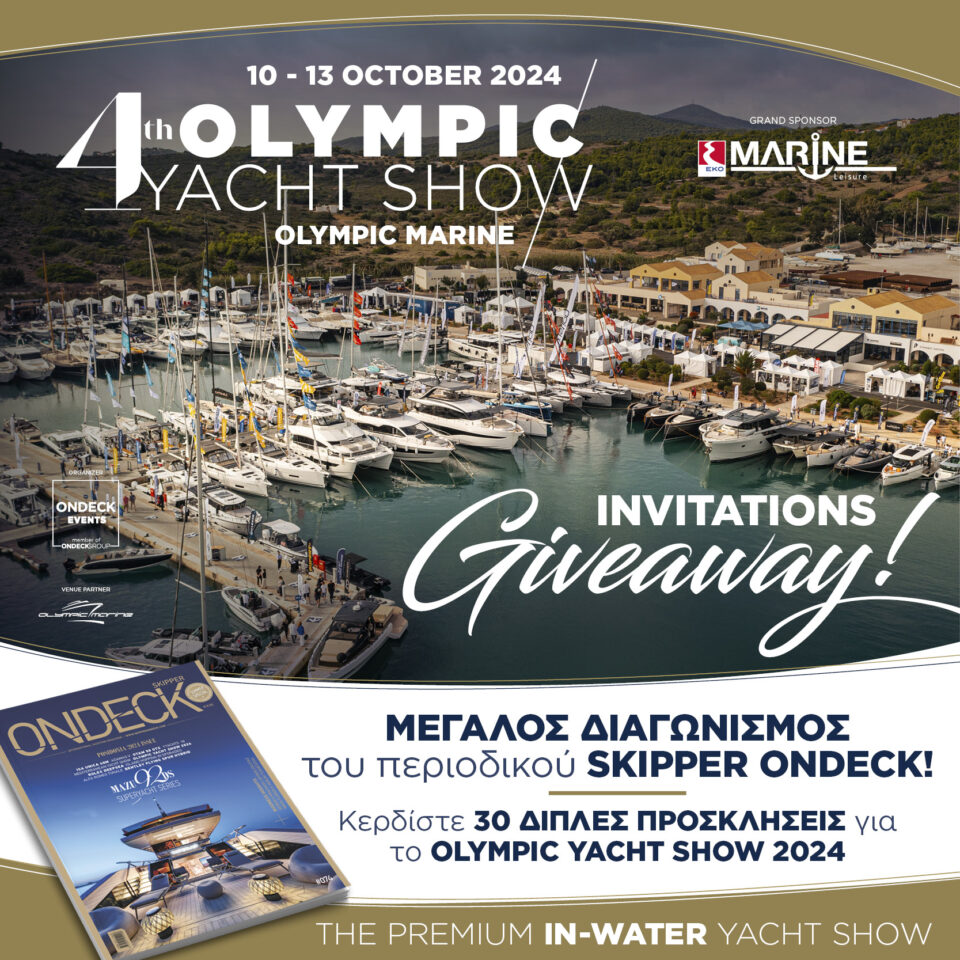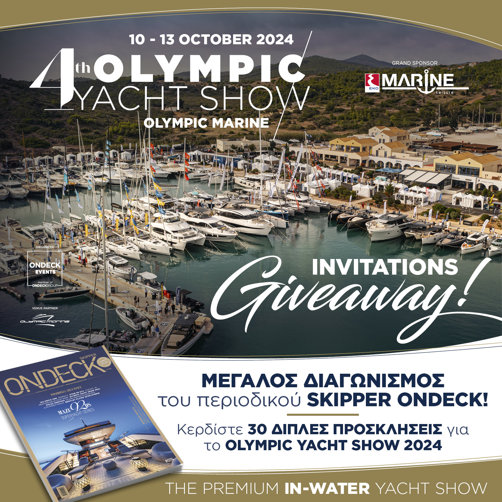 Τριάντα τυχεροί θα κερδίσουν μια διπλή πρόσκληση για δωρεάν συμμετοχή στο Olympic Yacht Show 2024, το πιο premium in-water show που διοργανώνεται για τέταρτη συνεχόμενη χρονιά η ΟΝDECK Events στις 10-13 Οκτωβρίου, στις μοντέρνες και ανανεωμένες εγκαταστάσεις της Olympic Marine στο Λαύριο.